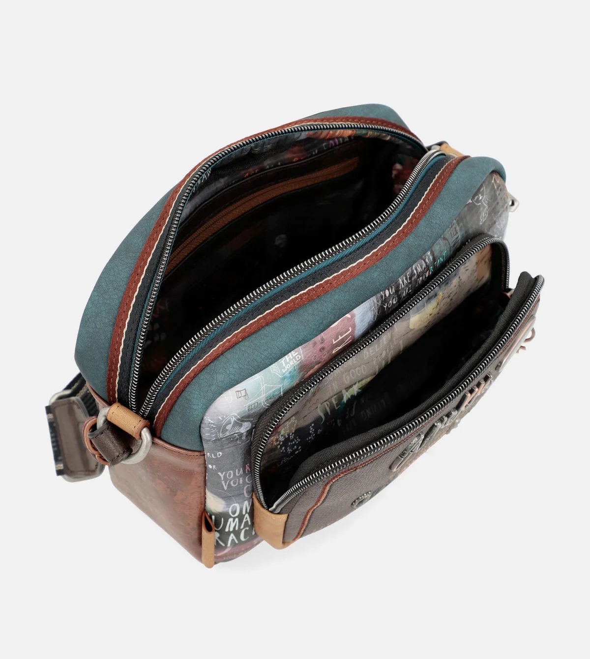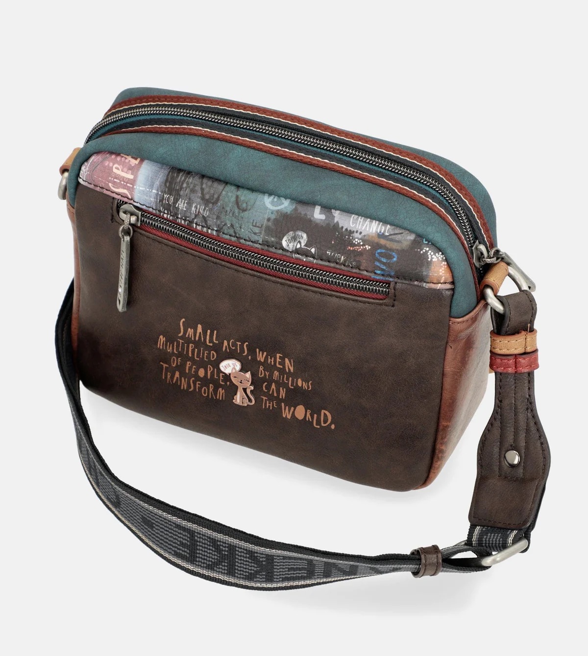 Esta bandolera para mujer es de tamaño mediano y cuenta con bolsillos en el frontal y la trasera. El estampado principal combina diferentes mensajes de paz e igualdad, con motivos y dibujos, en tonos ocre, gris, marrón y azul. La parte trasera combina diferentes tonos y parche de la colección.