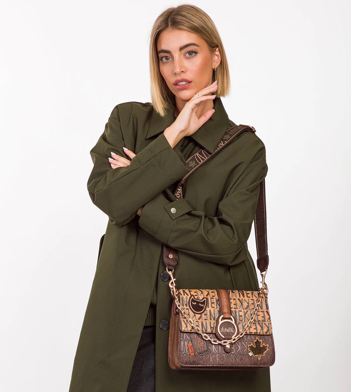 Esta línea se inspira en el lado más Urbanita de Canadá, donde las ciudades irradian vida. El logo de Anekke se convierte en el protagonista del diseño, siguiendo la tendencia de la logomanía, con diferentes texturas, terminados y materiales, y dándole un toque muy elegante a su diseño. Es un bolso en tono que combina tonos beige y marrones, con infinidad de detalles y un terminado de estilo envejecido, que le da un toque vintage.