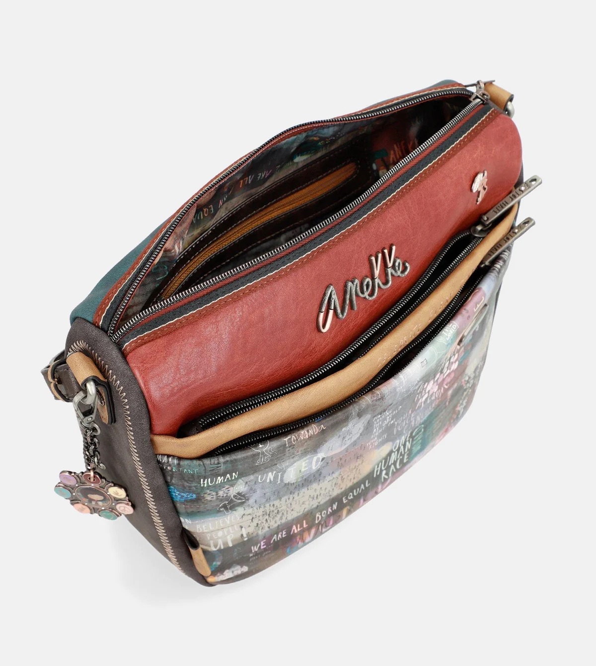 Por último, los detalles son infinitos. Encontrarás algunos como el logo con diferentes tonos y texturas, simbolizando la unión entre razas y etnias diferentes, pins, frases bordadas, parche con mensaje y el original llavero de la colección. Tiene un diseño único y muy simbólico, ya que Anekke aparece al centro rodeada por diferentes símbolos de paz y convivencia entre culturas, y un mensaje en la parte trasera: ¡El mundo como uno!